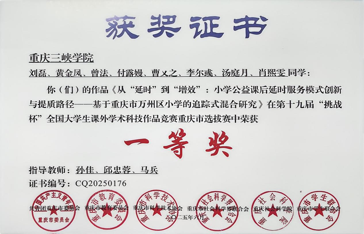 第十九届“挑战杯”全国大学生课外学术科技作品竞赛重庆市选拔赛一等奖