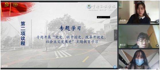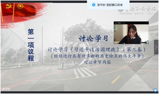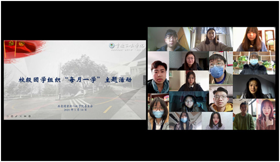 为持续深入学习《习近平谈治国理政》(第三卷)相关重要内容,进一步掀起我校各级团学组织学习“四史”热潮,2021年1月14日下午3:00,校团委以线上视频会议的方式,召开了校级团学组织(2021年1月)“每月一学”专题学习会。校团委青年服务中心主任张专老师,校级各团学组织主要负责人参加本次学习会。校团委(学生)副书记张华妙主持会议。