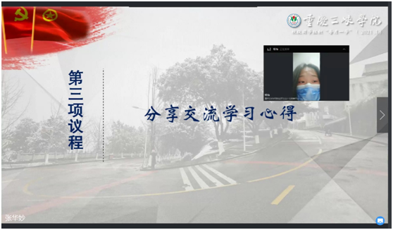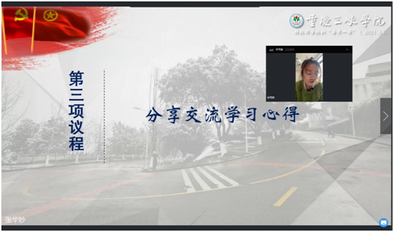 专题学习阶段,校团委(学生)副书记张华妙领学“党史、新中国史、改革开放史、社会主义发展史”对应内容。她从“四史”的含义内容、学习“四史”的意义和如何学好“四史”三方面向与会人员进行阐释。