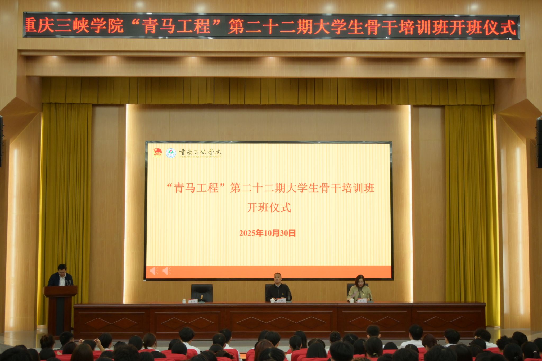 10月30日,学校“青马工程”第二十二期大学生骨干培训班在博学楼多功能厅开班。党委书记许光洪,党委常委、组织部部长谢昆出席开班式。150名参训学员及校级团学组织骨干代表参加活动。校团委书记王峰主持开班式。